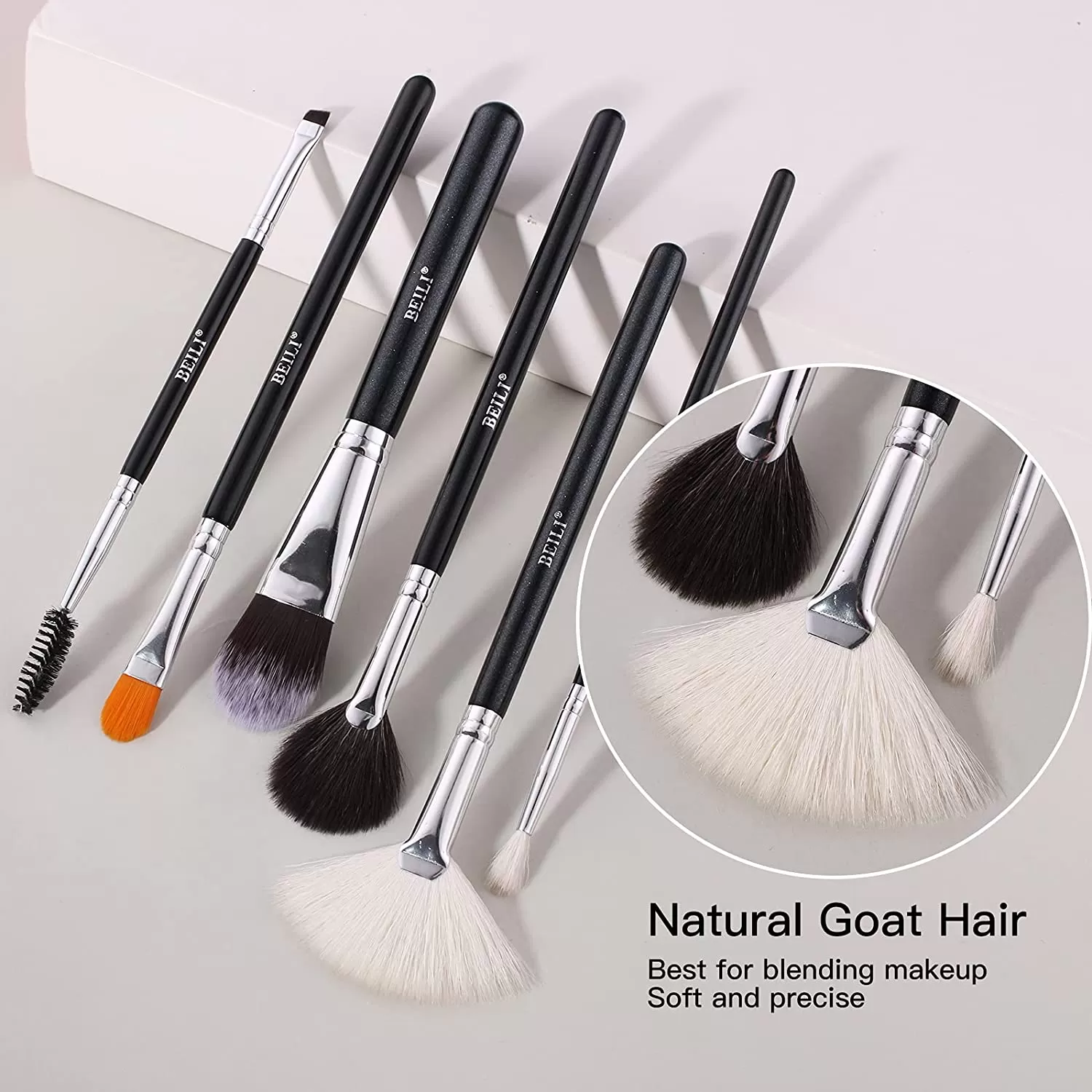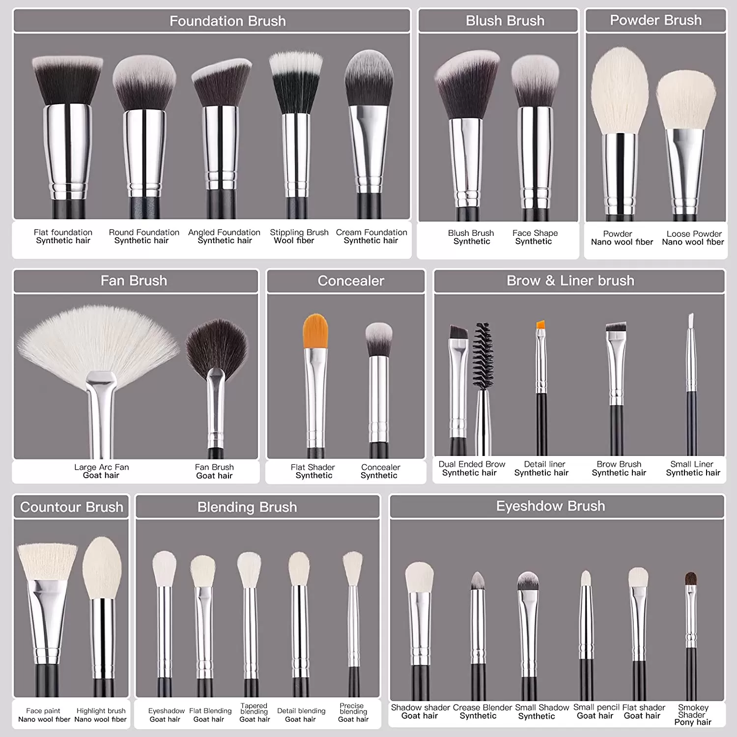 This set Offers Natural, Goat, Pony hair, Nano fiber and synthetic hair. Goat hair Touch skin-friendly, suitable for all skin types, softness like no other, They have excellent ability to grasp powder. Synthetic hair are soft and dense with different shape and sizes. High-tech Nano fiber Hair with Fine Soft Texture, super smooth touch, Good ability to grasp powder like animal hair, while they are easy to clean and quick dry.