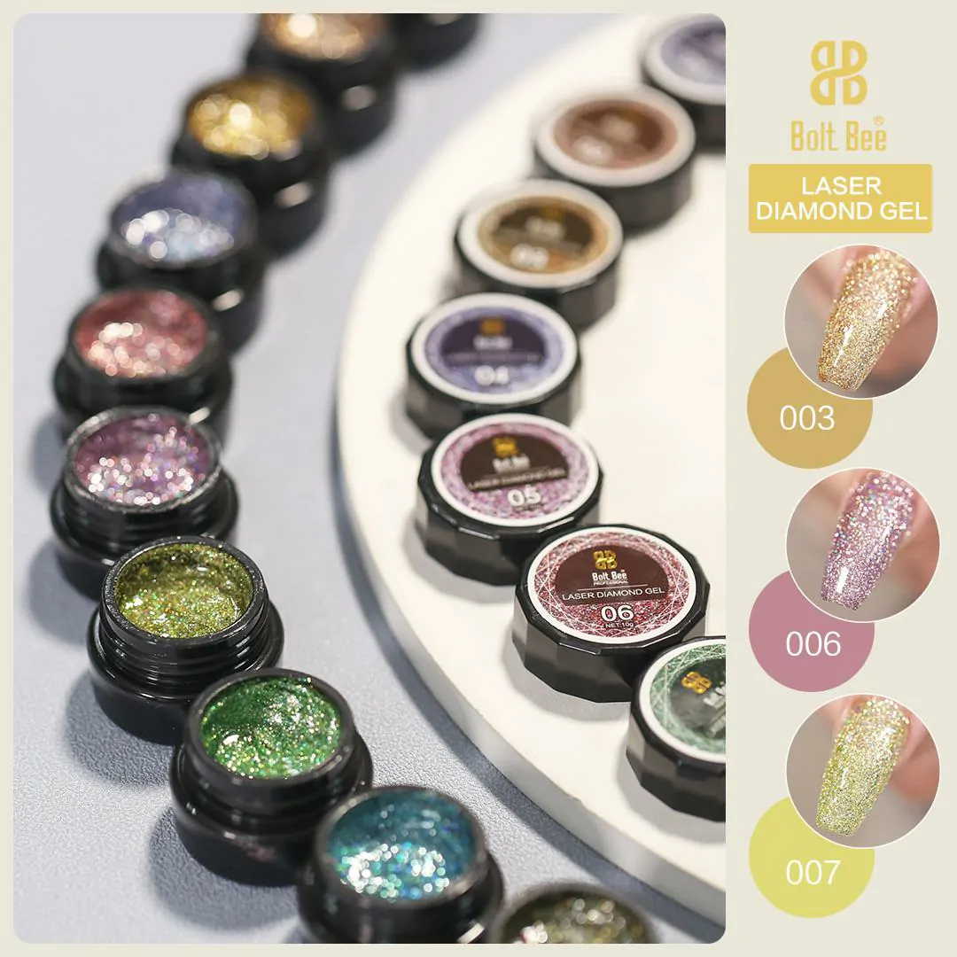 Bolt Bee Laser Diamond Gel (5ml) is a product that can give your nails a dazzling and sparkling effect. It is a gel polish that contains holographic glitter particles that reflect light and create a rainbow-like shine. Bolt Bee Laser Diamond Gel comes in different shades. Each shade has a different color of glitter, ranging from silver to pink to blue to purple. Bolt Bee Laser Diamond Gel can be applied over any base color or on its own for a full coverage look. It is easy to use, long-lasting, and soak-off friendly.