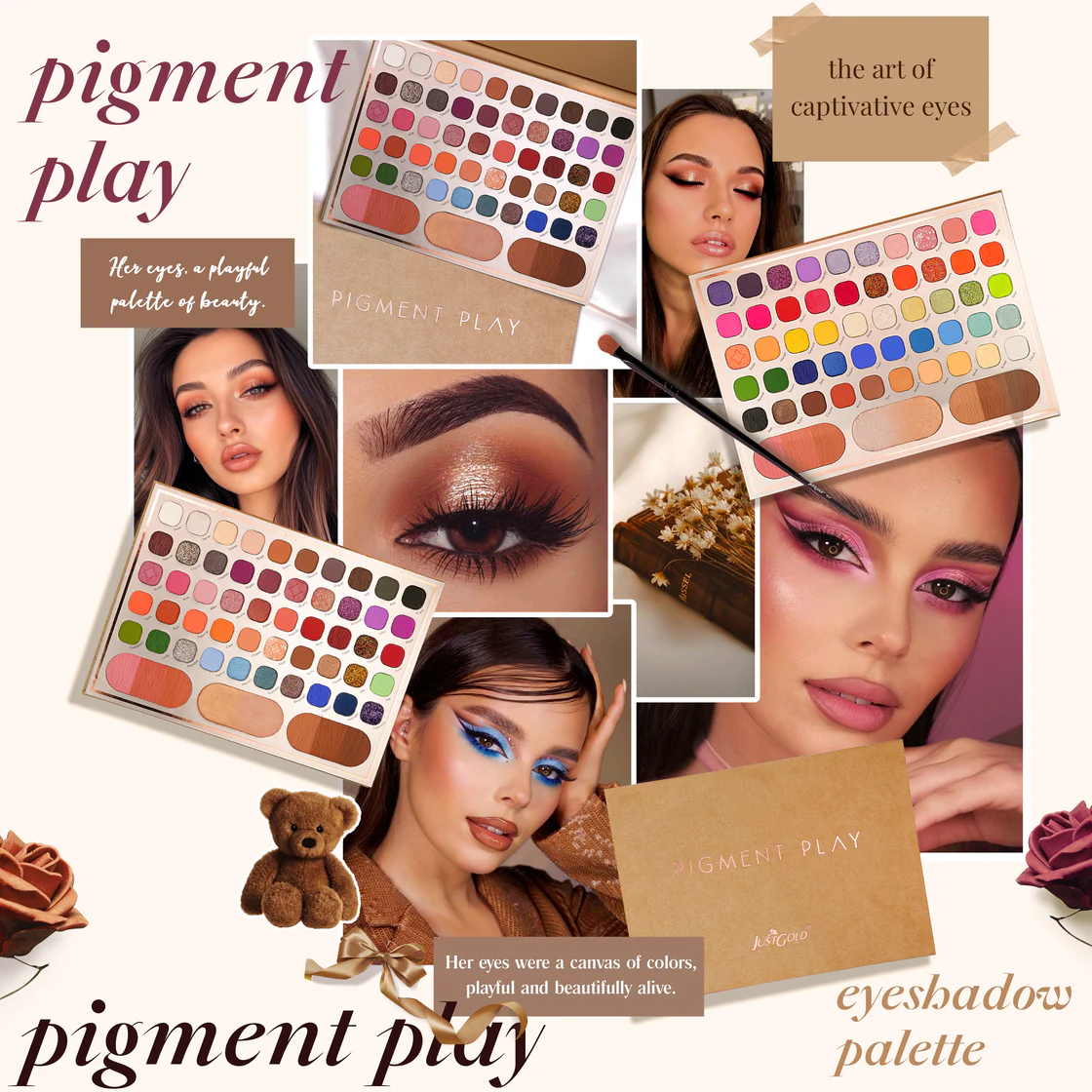 - Justgold Pigment Play Eyeshadow Palette with 59 Vibrant Colors, including Matte and Shimmer Finishes, Offering Richly Pigmented and Blendable Shades for a Flawless Eye Look