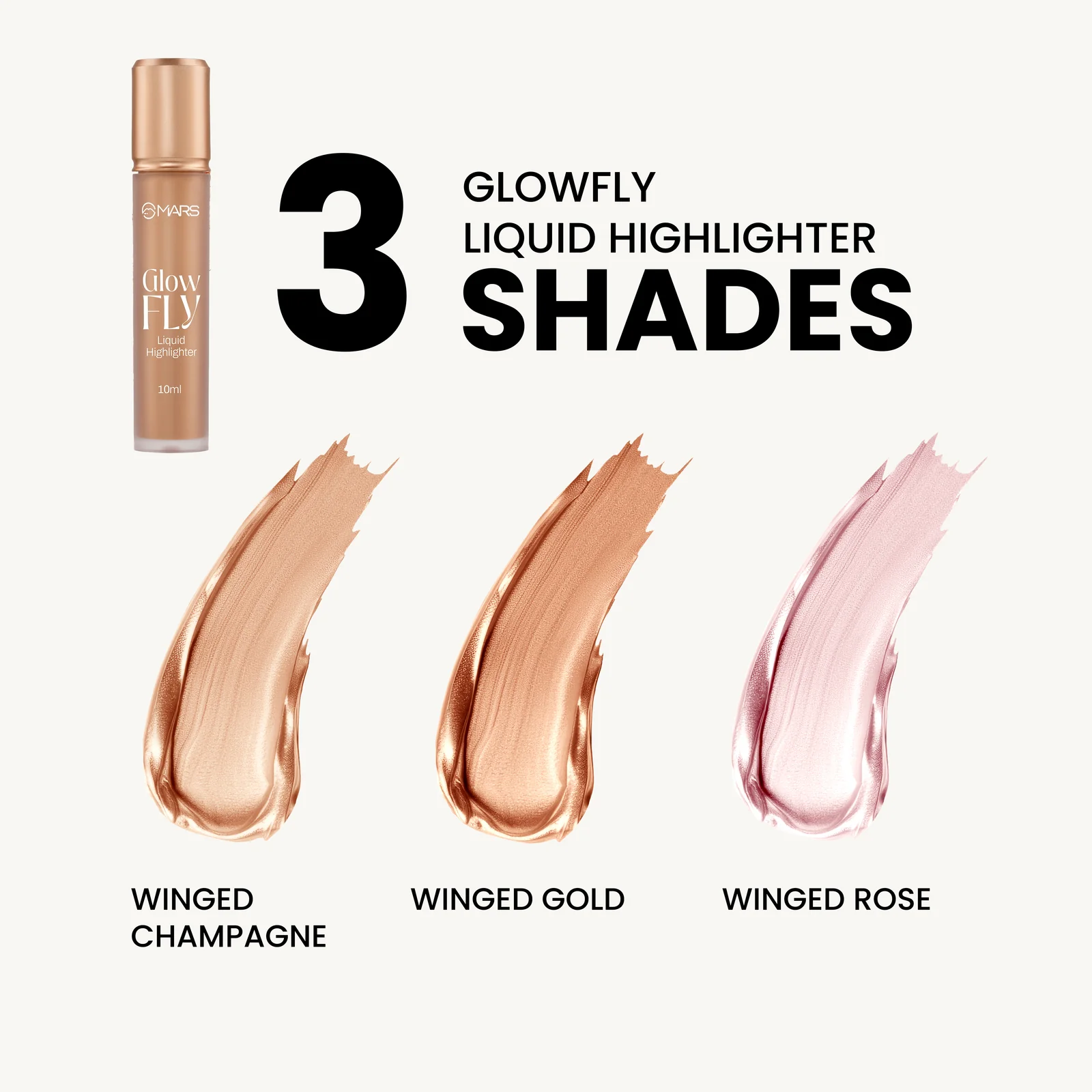 MARS Glow fly Liquid Highlighter, Your shortcut to that lit-from-Within glow. This ultra-refined formula delivers a liquid metal finish without a trace of chunky shimmer, giving your skin a smooth, luminous sheen that looks effortlessly natural.