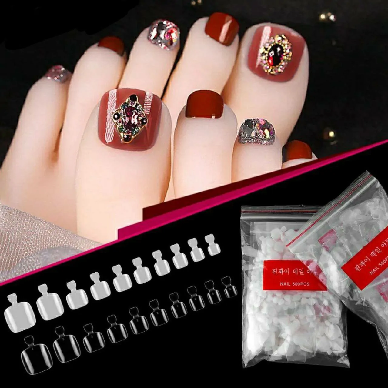 If you want to have beautiful and natural-looking toe nails, you can try these toe nail tips. They are made of high-quality ABS material, which is durable, non-toxic, and harmless to your nails and skin. They are easy to apply and remove with glue or stickers, and they can last for about 2-3 weeks. These toe nail tips come in 10 different sizes, with 50 pieces of each size. They are suitable for most people’s toe shapes and sizes. They are numbered from 0 to 9, so you can quickly find the right one for your nails. These toe nail tips are clear and transparent, You can paint them with your favorite nail polish, gel polish, or acrylic powder. They will make your feet look more elegant and charming. They are also a great gift idea for your friends and family who love nail art.