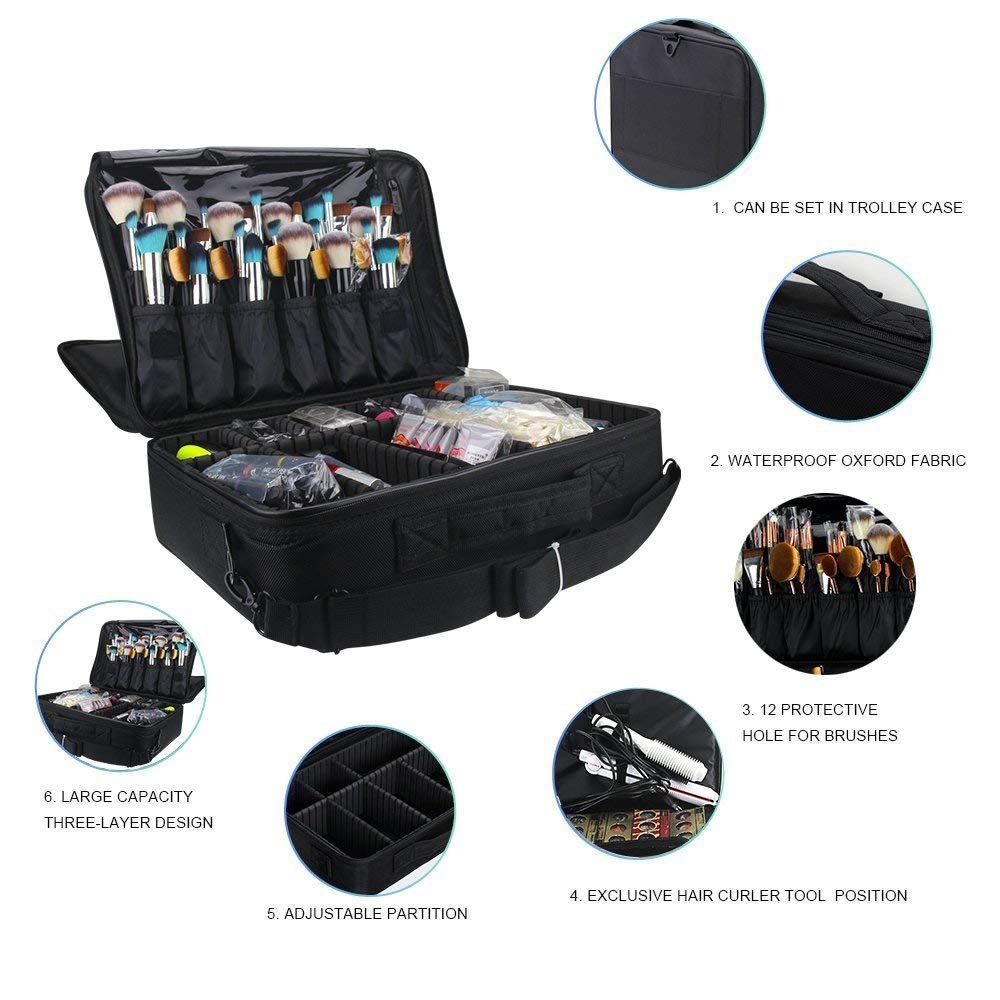 - EASY TO CARRY: This makeup case comes with a shoulder strap, use it as a shoulder bags or backpack. Allow attach to trolley case. Free your hands.; DIY YOUR OWN PLACE: This makeup case with adjustable dividers, you can move the partitions as needed, give you more space to arrange the stuff.
