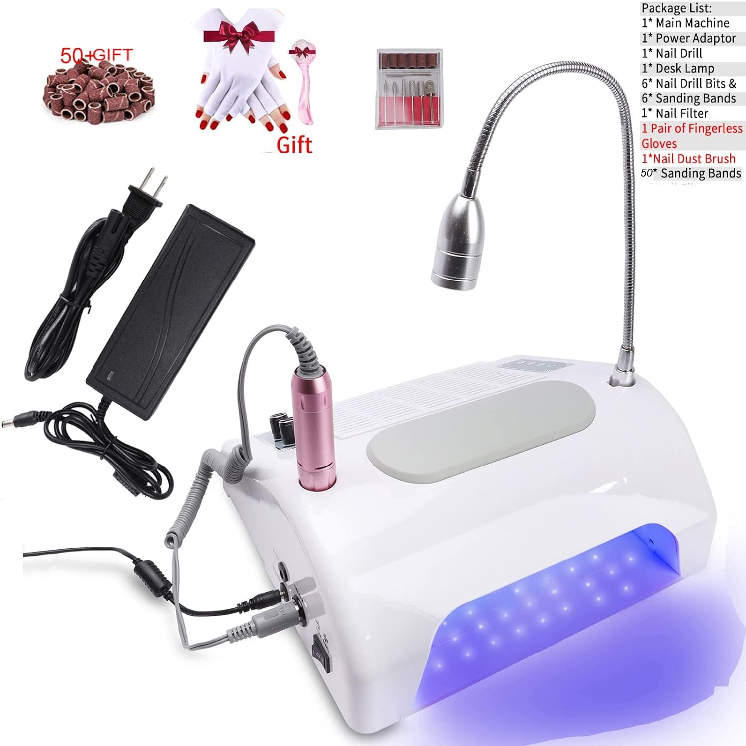 It combines UV LED nail lamp (48/96W), a Nail dust collector vacuum for nails, a 30000RPM electric nail drills machine, an LED Desk lamp for lighting, and a soft silicone hand pillow.