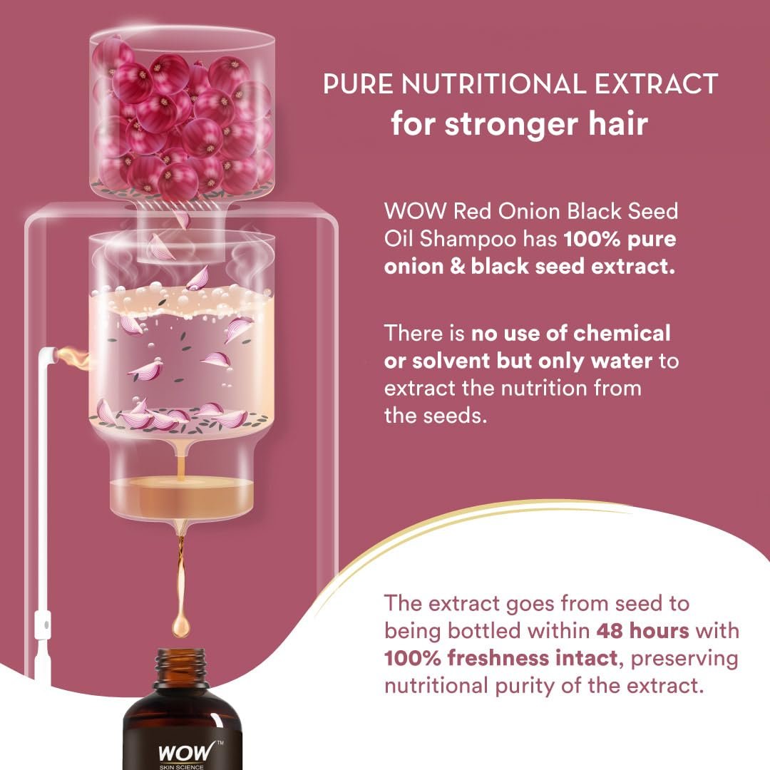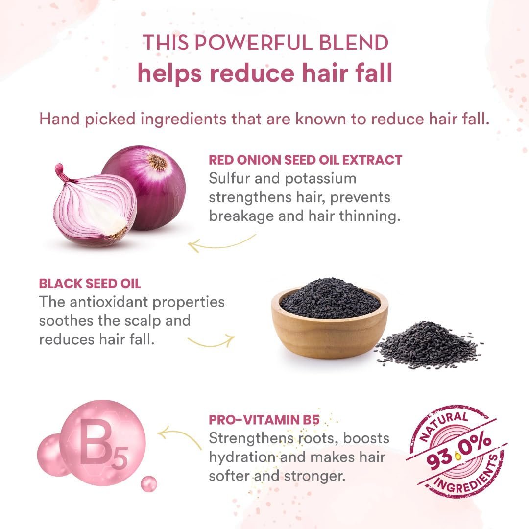 - Natural Ingredients for Stronger Follicles: Infused with the goodness of red onion extract and black seed oil, it rejuvenates tired scalps, strengthens hair follicles, and clarifies blocked roots.